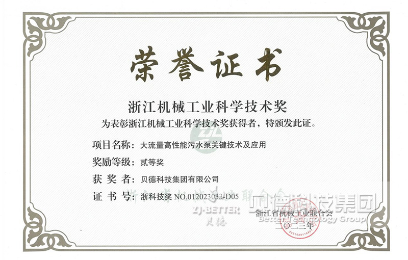 項,貝德科技集團有限公司憑借“大流量高性能污水泵關鍵技術及應用”項目榮獲二等獎。